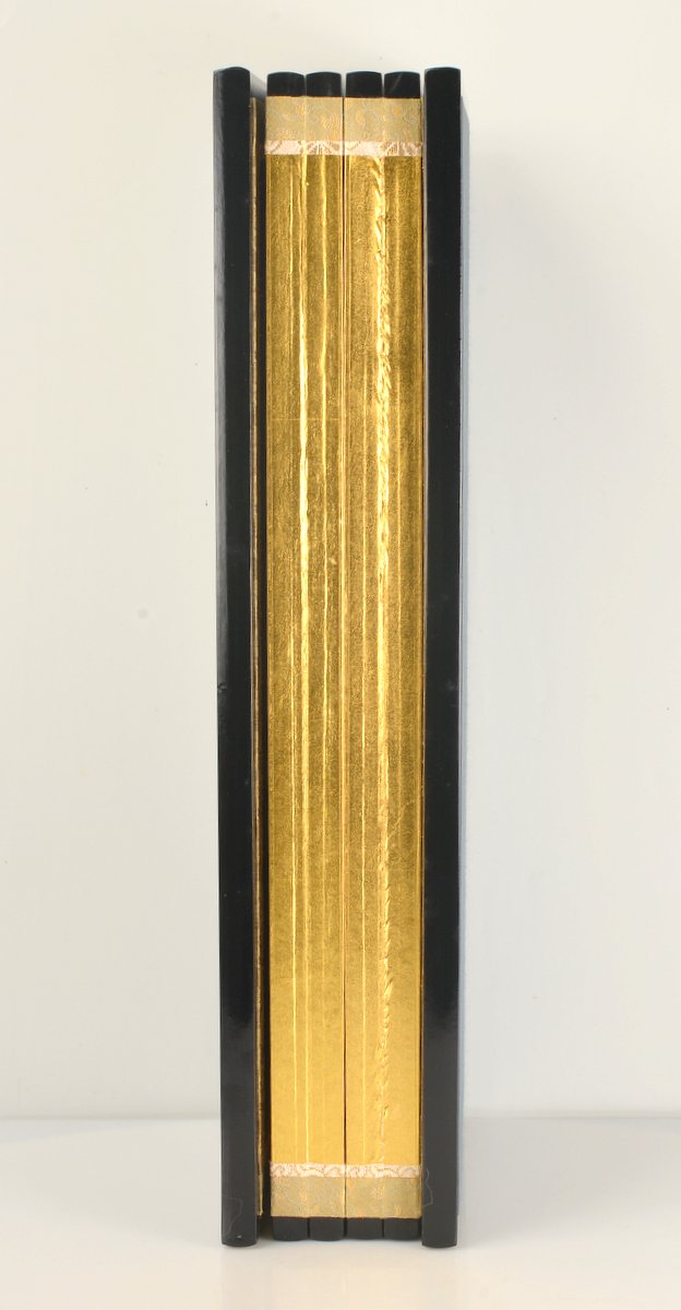 Ce paravent a été réalisé selon la technique du Kinpaku-oshi (金箔押), ce qui signifie que chaque feuille d’or a été appliquée à la main, une par une, par un maître doreur. Ce travail minutieux crée une texture unique et une profondeur de couleur que les imitations modernes ne peuvent égaler. Le dos est habillé d’un tissu bleu nuit sobre