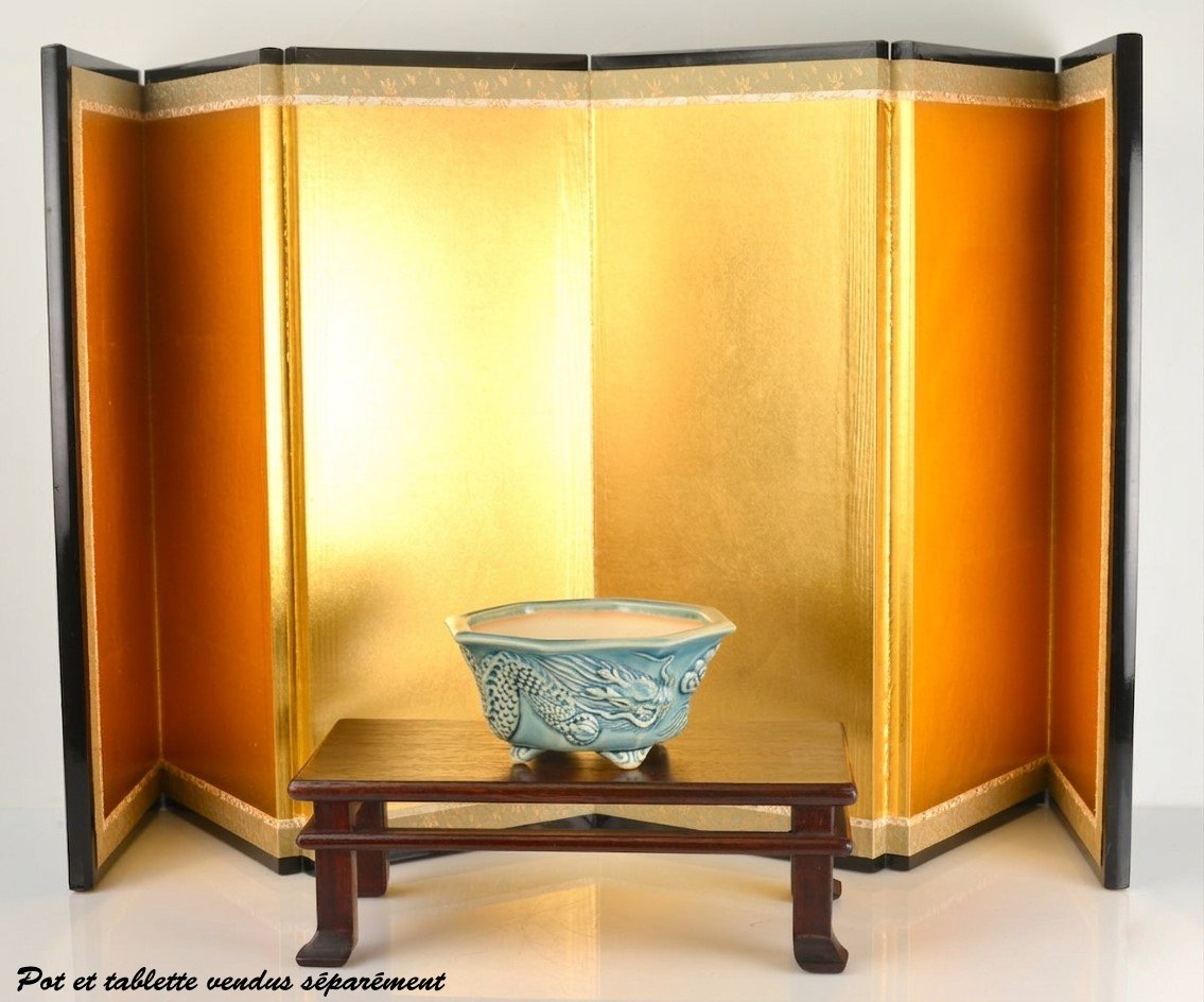 Ce paravent d’exception est une pièce authentique de l’artisanat traditionnel japonais, conçue pour sublimer la présentation de vos bonsaïs ou pots de collection. Il est livré complet dans sa boîte d’origine (O-Byōbu), accompagné de ses certificats d’authenticité.