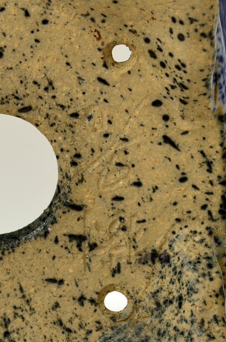 Pot signé au clou par l’artiste Shūkō (樹晃). Notez la forme particulière de ce pot, c’est une pièce technique complexe qui combine des lignes rondes et carrées dans une forme sophistiquée, mise en valeur par un émail Yōhen exceptionnel.