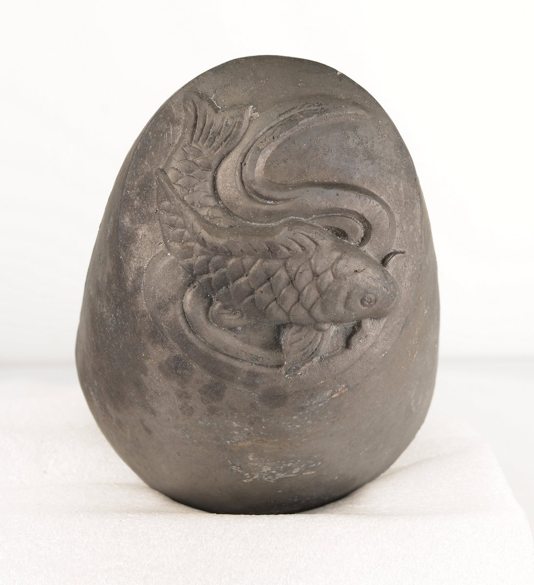 Cette pièce présente un travail de relief remarquable sur les écailles et le mouvement de l’eau. Sa patine Ibusu (terre cuite fumée) offre des nuances gris de fer caractéristiques des tuiles de haute qualité ayant affronté les éléments sur le toit d’une demeure traditionnelle.